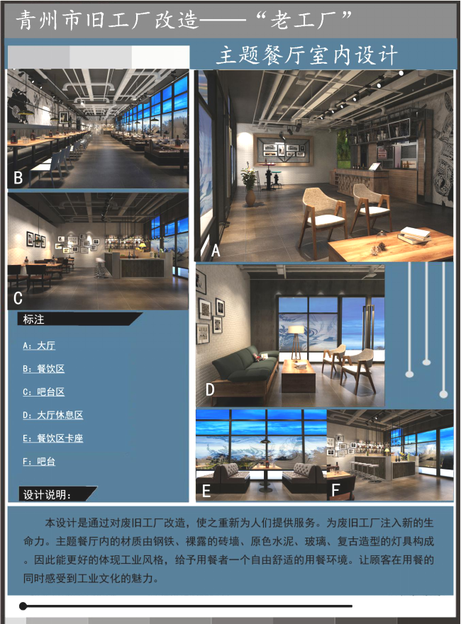 三等奖作品:《青州市旧工厂改造——“老工厂”主题餐厅室内设计》 作者:刘楷 指导教师:杨帆