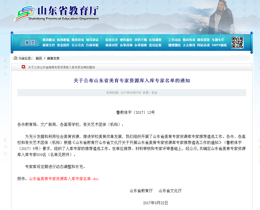 近日,山东省教育厅公布了“山东省美育专家资源库入库专家名单”入选名单,公司有17位教师入选。