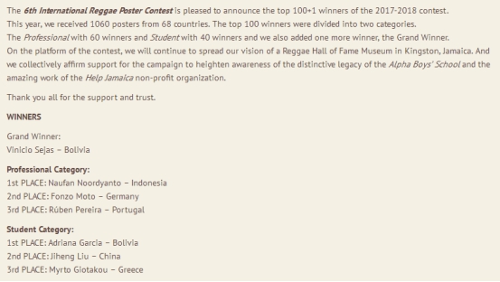 2018第六届国际雷鬼音乐海报比赛收到了来自68个国家的1060件作品。此次比赛共选出100件获奖作品及1件全场大奖,包括专业组作品60件、员工组作品40件。ladbrokes立博杨蜜老师指导的17跨视传员工刘继衡作品荣获员工组第2名、第11名;刘新宇的作品荣获员工组第13名。