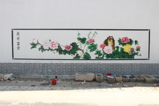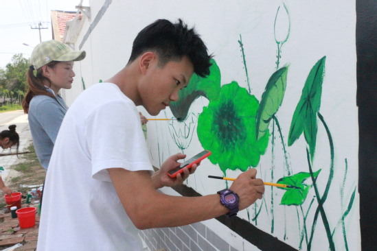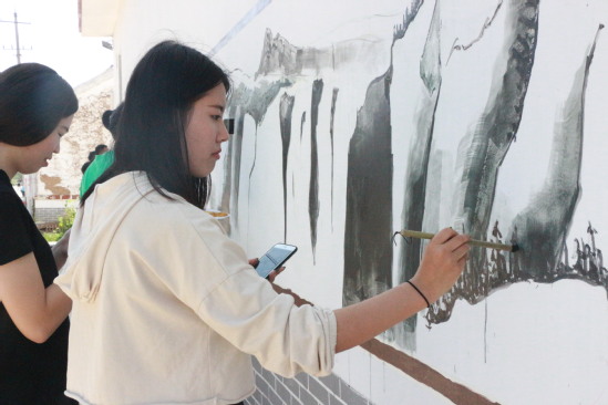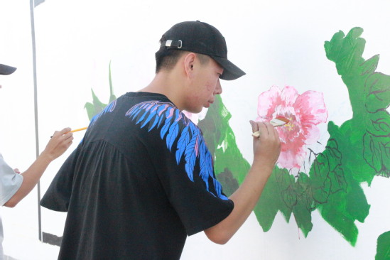 烈日炎炎,骄阳似火,服务团同学脚踩着这片朴实的土地,热情高涨,干劲十足,从准备画具、测量墙面、调试颜料开始,活动过程中,烈日暴晒,挥汗如雨,汗水湿透衣衫,队员们不叫苦,不叫累,克服重重困难,默契配合,挥笔泼墨,精心绘制,耐心向村民诠释图画、标语的内容和内涵。经过长达10个多小时的高温下高强度的作业,顺利完成了8幅、共计100余平米的墙绘作品。