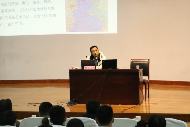 “山东鼓子秧歌”2006年入选首批国家级非物质文化遗产名录。徐成龙教授结合“山东鼓子秧歌”从九个方面介绍了非物质文化遗产、“非遗舞蹈”以及山东鼓子秧歌的起源、艺术表现形式、风格特点等内容,明晰了传统文化与现代生活的关系。徐成龙教授在报告中特别提到:当代社会,保护好、利用好非物质文化遗产,对于民族精神的凝聚和延续,对于实现中华民族的伟大复兴、丰富民众美好生活需求等方面,都具有不可估量的重大作用。作为“非遗”的鼓子秧歌是中华民族身份的象征,是培育中华民族认同感的宝贵资源,是促进民族团结、保持国家统一的坚实基础,是凝聚全国各族人民的重要力量;舞蹈作为“非遗”中的重要一支,具有一定的保护与传承的价值及意义。