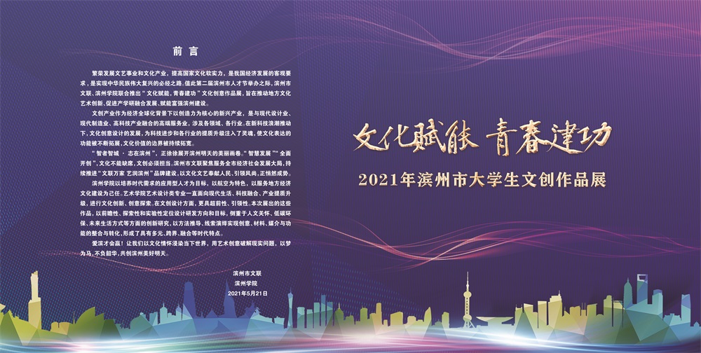 滨州市文联聚焦服务全市经济社会发展大局,持续推进“文联万家 艺润滨州”品牌建设,以文化文艺奉献人民、引领风尚,正悄然成势。“智慧发展”“全面开创”,文化不能缺席,文创必须担当。“智者智城·志在滨州”,以“文化赋能,青春建功”为主题,助推富强滨州建设,庆祝建党100周年。