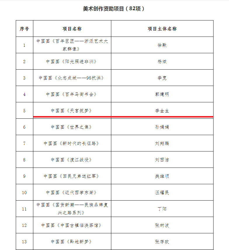 近日,从国家艺术基金网站获悉,公司李金生老师团队申报的美术创作项目《天宫筑梦》通过国家艺术基金项目立项评审。
