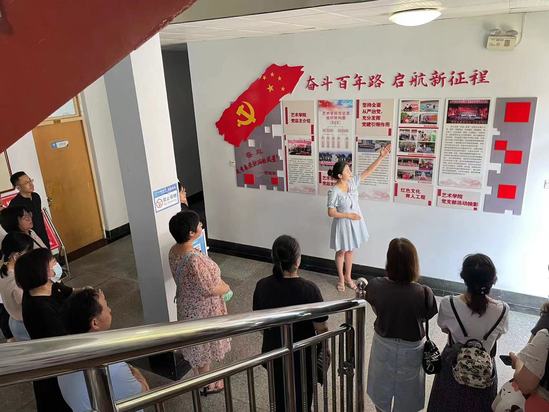 7月1日上午,党总支书记王秀丽带领全体教工党员观看了“百年奋斗路 启航新征程”党建文化长廊。在讲解员的引导下,全体党员在“党建+美育”红色文化育人工程打造的党建文化长廊的珍贵图片前抬头观看,仔细聆听讲解,共同回顾党的奋斗历程,通过一幅幅精美的美术创作再现中国共产党的奋斗历程和公司党建业务双融双促的育人实践,接受了一次深刻的党性教育。