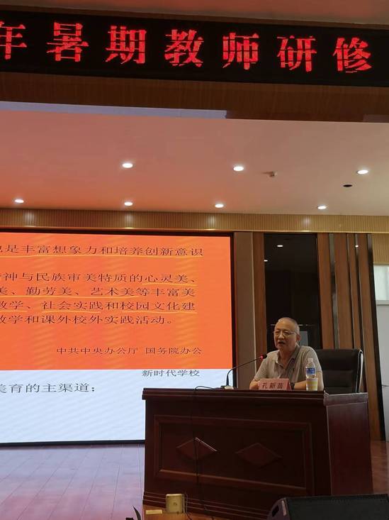 其中,特邀教育部艺术教育委员会常务委员、国家基础教育课程标准研制组成员、中国美术家协会美术教育委员会副主任孔新苗教授,进行了为期一天的专题讲座。孔教授上午的讲座题目《艺术课程的“大单元“教学》,对“大单元“教学进行生动详实地讲解,通过《花与艺术美》教学案例,明确了”大单元”“大观念”“大任务“等概念,以课程综合实践大单元主题,用比较方式实现文化理解等,解读新课标的新理念与未来发展路径。下午讲座题目《学业质量评价与艺术中考》,是对国家政策进行梳理解读,提出构建“评价串”的观点,提出评价要坚持素养导向,坚持以评促学、重视表现性评价,坚持多主体评价等。