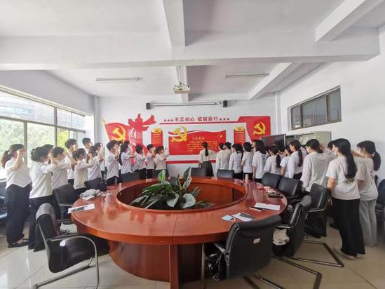 最后,在员工党支部书记的带领下,全体党员起立,举起右手、握紧拳头,庄严宣誓。毕业生重温入党誓词,表达了对坚定政治信念和时刻不忘初心、矢志永远奋斗的坚定决心。