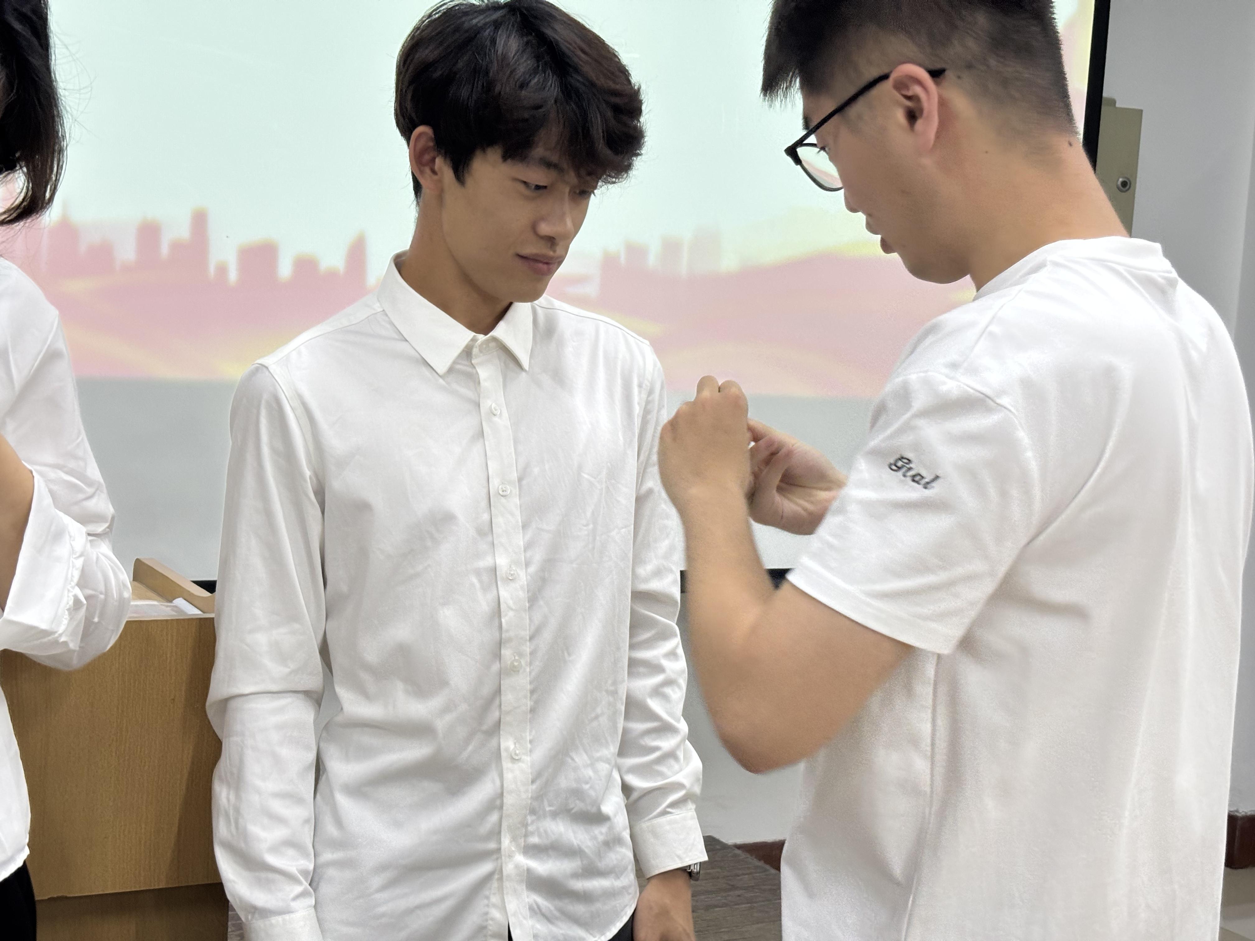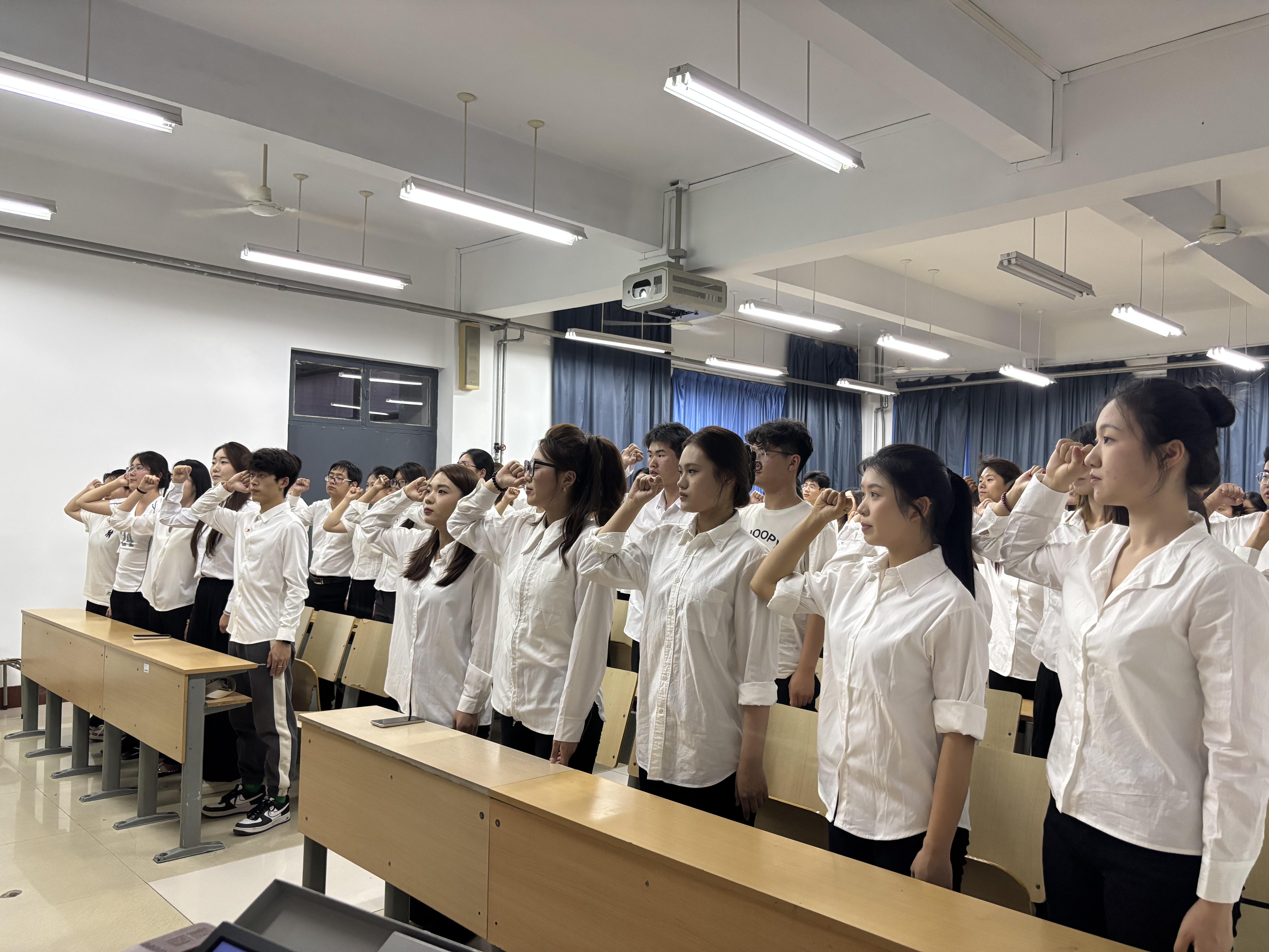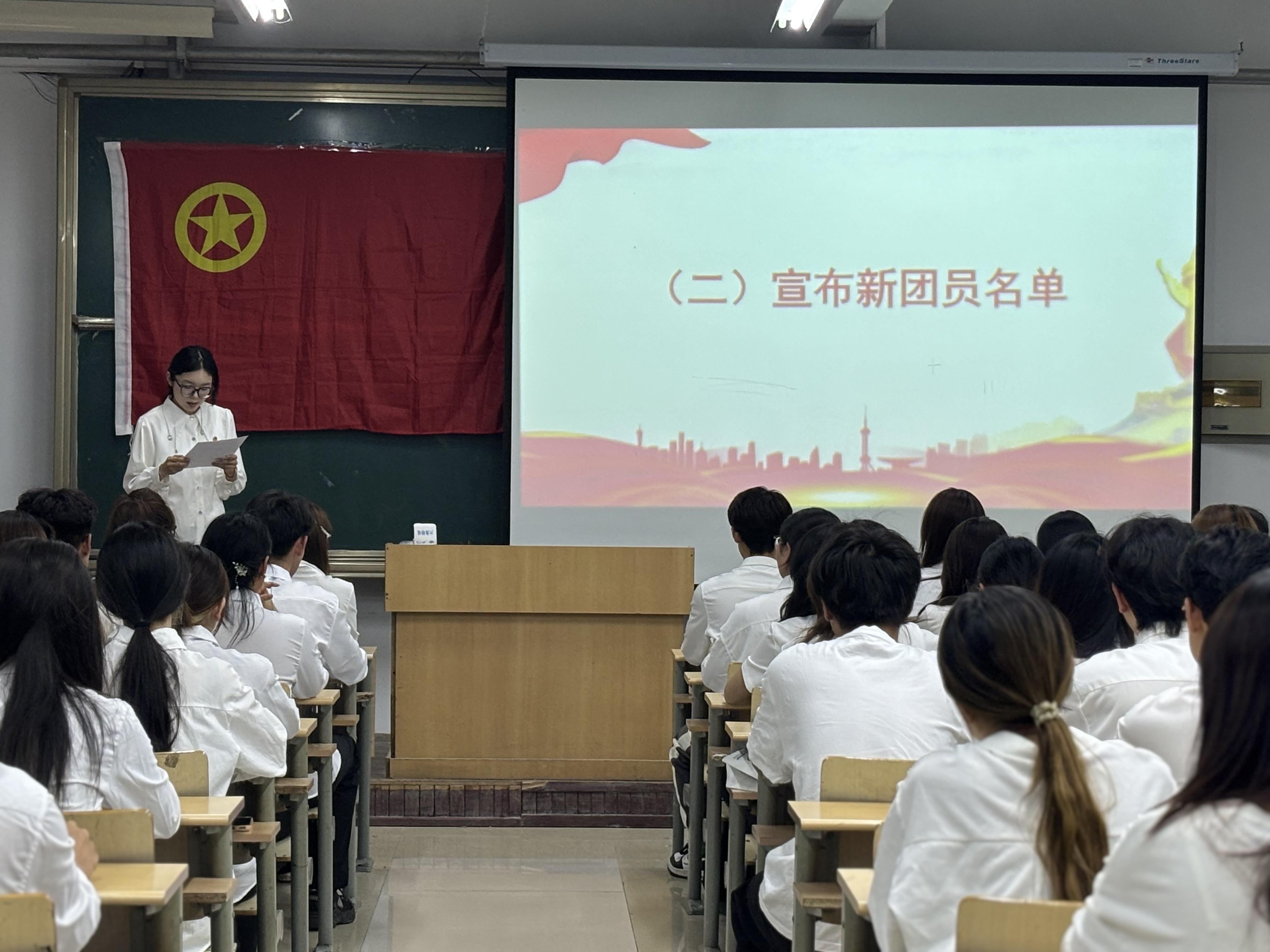 随后,会议宣布新团员名单,段老师上台为新团员逐一颁发团徽徽章,现场掌声热烈。佩戴上团徽后,全体团员面向团旗立正,举起右手庄严宣誓:“我志愿加入中国共产主义青年团……为共产主义事业而奋斗!”铿锵有力的誓言回荡在场地上空,彰显着团员们的坚定信念与责任担当。